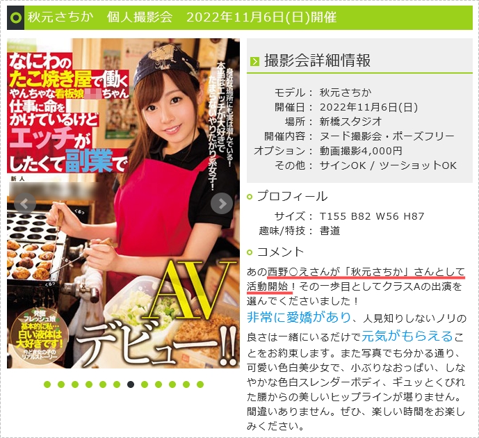 马上来查她的身份:透过社群,我们知道演出的女优名叫「秋元ちさか(秋元千彩花)」,这是一个非常陌生的名字,目前没有twitter,不过膜拜估狗大神就可以知道她最近要举办摄影会,而上面是这么介绍她的: