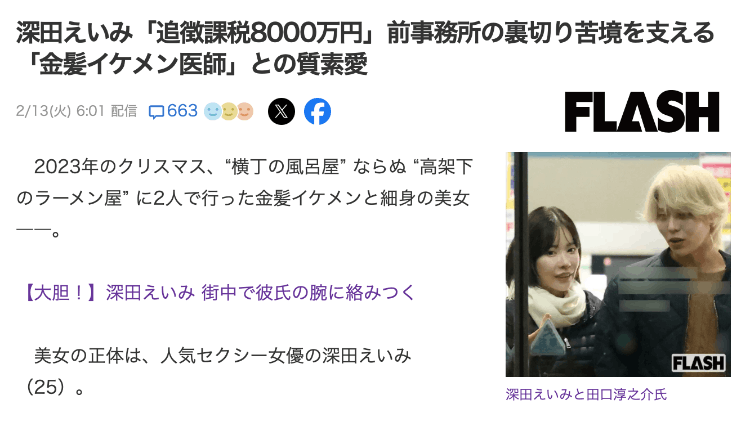这次又发生了什么事?原来她被拍到谈恋爱了ー照片上那位金发帅哥是个在医美诊所上班的医生也是个油土伯(Youtuber),报导中说两人是一年半前认识并且交往的:虽然之前深田えいみ(深田咏美)曾因为「约会就该男方买单」的发言导致社群炎上,不过就狗仔们的观察是她与男友都过得很省,几次约会看下来双方都没花什么钱?